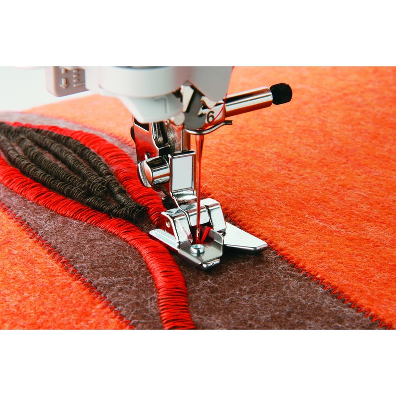 - Fringe foot adds surface texture and applies custom trims