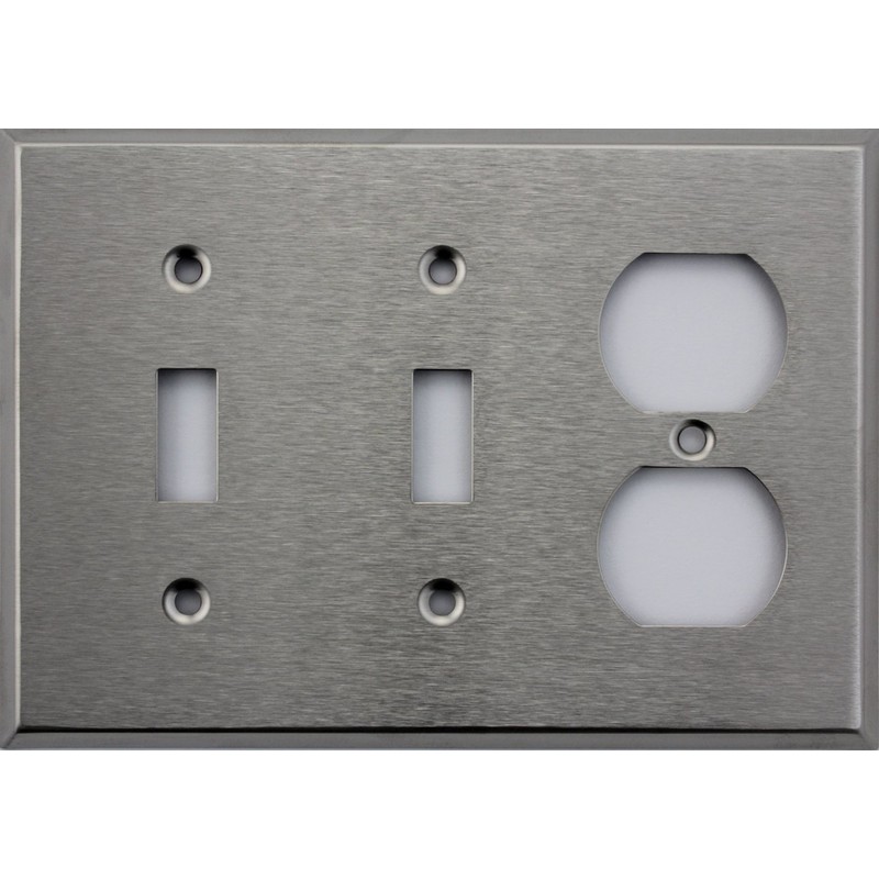 Brushed Satin Stainless Steel 3 Gang Wall Plate - 2 Toggle Switches 1 Duplex Outlet
