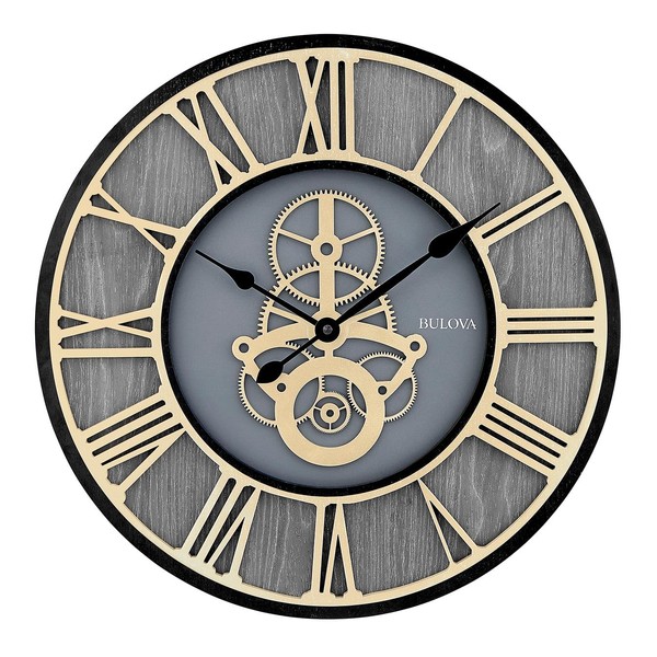 Bulova Timepiece Gear Wall Clock C4347 | 20" Ash Veneer Frame with Gold Roman Numerals | Quartz Movement | Battery Operated | Industrial-Inspired Design