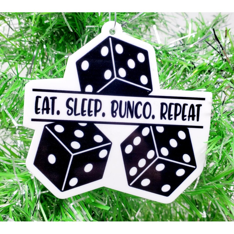 Add a touch of fun and camaraderie to your holiday decor with our "Bunco Dice Themed Christmas Ornament - Eat, Sleep, Bunco, Repeat." This delightful ornament celebrates the joy of the popular dice game and the bonds of friendship it fosters. Crafted with care and a playful spirit, this ornament features colorful dice and the whimsical mantra, "Eat, Sleep, Bunco, Repeat." It perfectly captures the spirit of Bunco enthusiasts who enjoy the excitement of rolling the dice and gathering with friends to play this social game. Made from high-quality materials, this ornament is designed to withstand the test of time, becoming a cherished part of your holiday decorations for years to come. It includes a sturdy hanging cord, allowing you to easily display it on your Christmas tree, wreath, or anywhere else you'd like to celebrate the Bunco spirit. Whether you're a seasoned Bunco player or someone who loves the thrill of social games, this ornament is a delightful addition to your holiday festivities. It's also a fantastic gift for fellow Bunco aficionados, reminding them of the fun and laughter shared during Bunco nights. Celebrate the joy of Bunco and bring a dose of merriment to your holiday season with our "Bunco Dice Themed Christmas Ornament - Eat, Sleep, Bunco, Repeat." Let your tree sparkle with the excitement and camaraderie of this beloved game, making your holiday celebrations even more enjoyable with this unique and spirited ornament. Roll the dice and have a blast this holiday season!