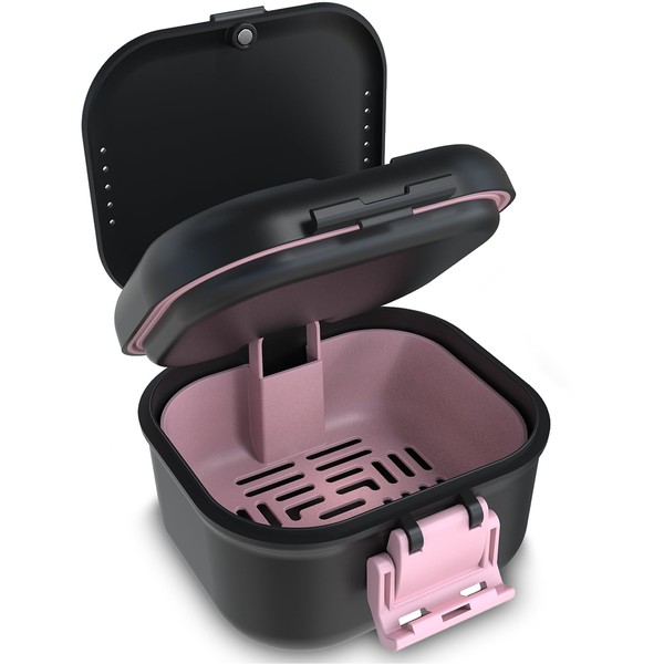 BVN Leakproof Denture Cup, Upgraded Carrying Storage, Denture Cup for Soaking Dentures,Denture Bath Box with Filter, Travel Retainer Cleaning Case (Black+Pink).