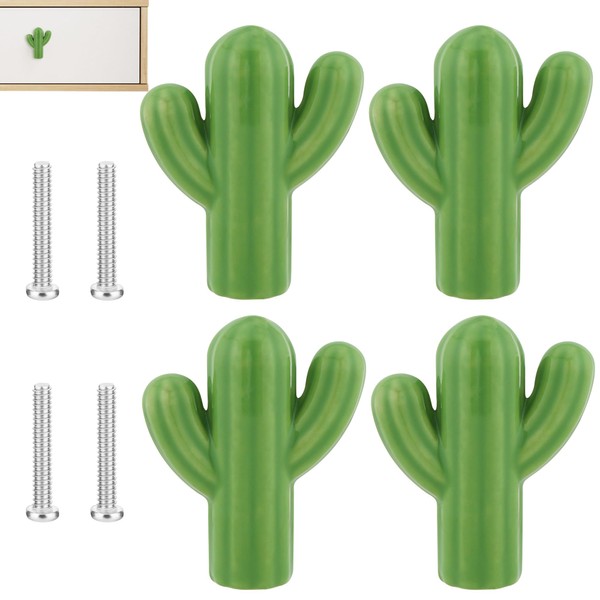 Cute Glossy Ceramic Knobs Cactus-Shape Lovely Door Pull Knob Cabinet Closet Ceramic Drawer Cupboard Kitchen Dresser Bedroom Pulls Wardrobe Handles (Green, 4 Pcs)