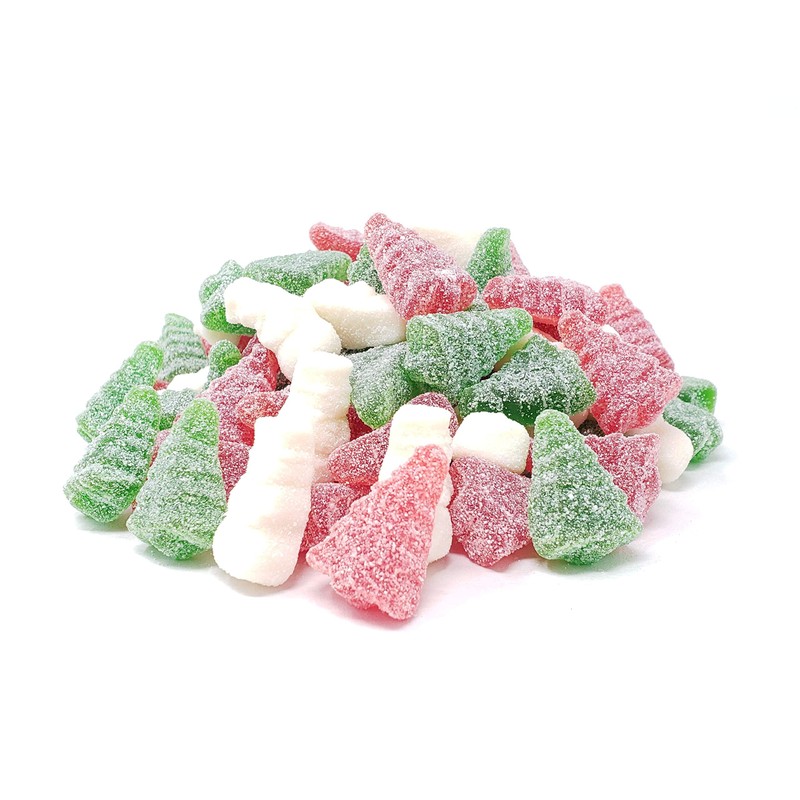 - These sweet and chewy gummi candies come in three festive colors – red, white and green, making them perfect treats for the holiday season. Sanded with sugar these gummi treats are perfect for displaying this Christmas season.
