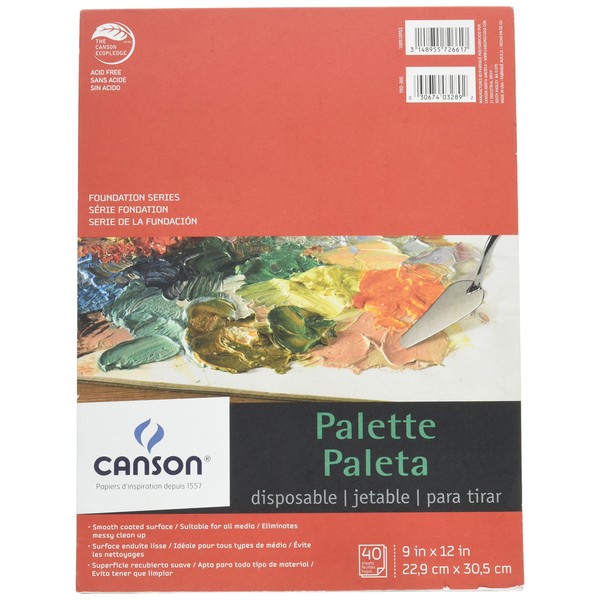 This specially treated heavy white paper is suitable for oils or acrylics. Tear off one sheet at a time and throw away the mess. The Canson Disposable Palette contains 40 sheets and has a rigid-back pad. - Canson Disposable Palette - 9'' x 12'', 40 Sheets