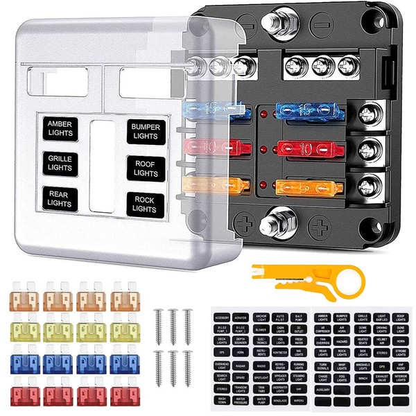 - Perfect for your vehicle: Fuse holder contains 6 x automotive fuse block box x 1, 20A fuse x 4, 15A fuse x 4, 10A fuse x 4, 5A fuse x 4, labels x 2, screws x 6 and stripping tool x 1. 6-compartment blade fuse box satisfy your brew.