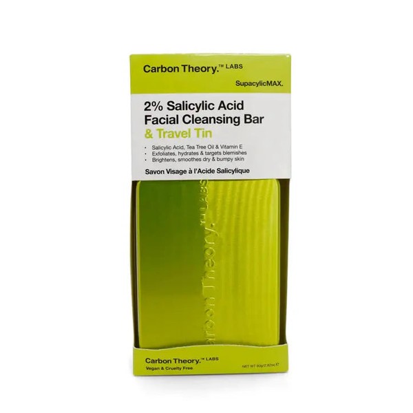 The Carbon Theory SupacylicMax Tin & Bar is your powerful travel buddy against blemishes! This compact travel set contains the iconic cleansing bar with 2% salicylic acid in an exclusive travel size, packed in a stylish TSA-approved aluminium tin. Perfect for on the go or on holiday!