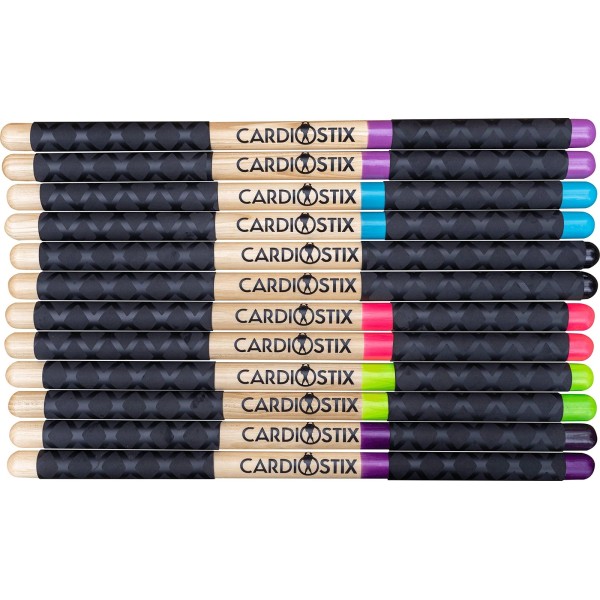 - *** FUN, VIBRANT COLORS (added black grip added to strike zone to protect wood, when this breaks down simply remove with scissors and use as normal) CardioStix Premium come in FIVE different, fun colors! Express yourself and personality with the color of your drum sticks . Walk into that class with either Teal, Pink, Purple, Black, or Green Cardio Drum Sticks!
