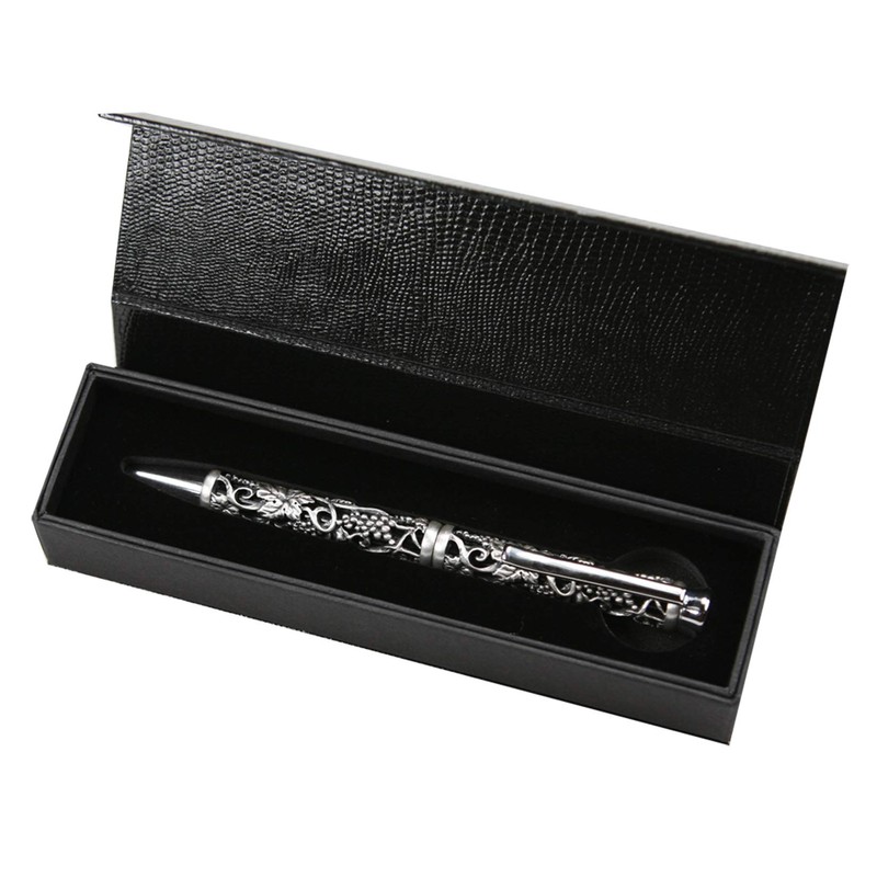 - Unique pen, made by specially carved metal with a grape pattern. Contrasting matt metal and black lacquered, polished finishes. Stylish and elegant. This lovely office accessories beautifully presented in a gift box, making this an ideal present.