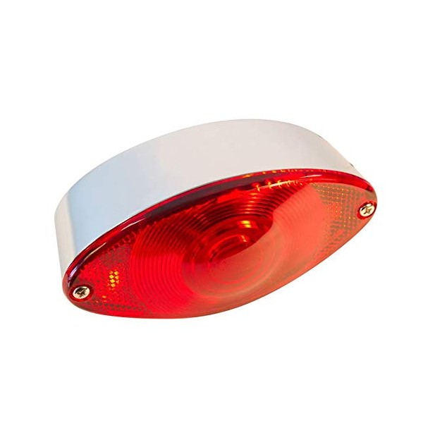 Chrome Cat Eye Brake/Tail Lamp (With License Plate Light) and chrome die cast housing. The two wire hook-up for the brake and tail lights mean this light is self grounding. Red wire is 12V positive brake light. Black wire is 12V positive running light. This light uses a standard incandescent automotive 1157 bulb (included). Dimensions: 5" wide, 2" thick, 2.75" tall, with 2" bolt spacing.