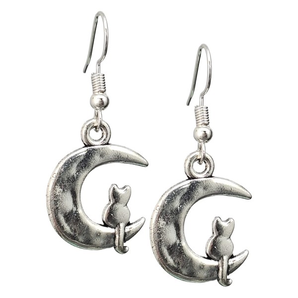 Cat Sitting on Crescent Moon Antique Silver Tone Handmade Dangle Earrings