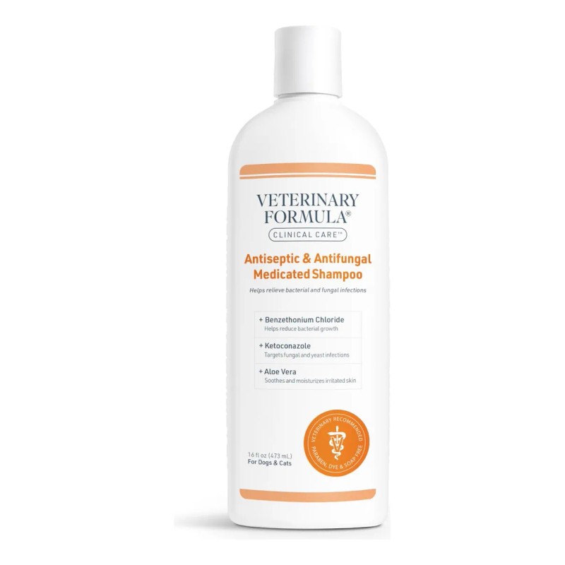 Champú medicinal antiséptico y antimicótico Veterinary Formula Clinical Care para perros y gatos, 16 onzas líquidas, ayuda a aliviar la piel escamosa, grasosa y roja, sin parabenos ni colorantes, sin jabón (1 paquete), AYUDA A MANTENER UNA PIEL SANA. Al lavar y remojar el pelaje durante 5 a 10 minutos, nuestros poderosos ingredientes actúan para ayudar a calmar la piel roja, escamosa, grasosa o maloliente que puede causar molestias a tu mascota. - De acción rápida, actúa rápidamente para calmar la piel La piel sensible de tu mascota que puede verse afectada por factores estresantes ambientales. - RECOMENDADO POR UN VETERINARIO Este champú para mascotas tiene un pH equilibrado para la piel de tu mascota y es sin parabenos ni jabón para promover la salud general de la piel y el pelaje sin dañar los detergentes. - PARA PERROS Y GATOS Nuestro champú para perros y gatos está destinado a mascotas de más de 12 semanas. Úselo dos veces por semana hasta que la piel se aclare y, a continuación, una vez a la semana para ayudar a mantener la salud de la piel. - APLICACIÓN: Este producto está diseñado únicamente para uso tópico. Lea atentamente las instrucciones antes de aplicarlo en el pelaje de su mascota. Pruébelo en un área pequeña para evitar una mayor sensibilidad antes de usarlo.
