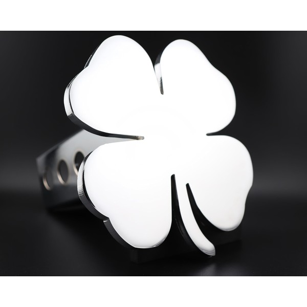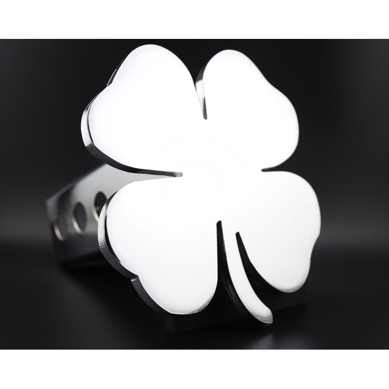 Chrome Four Leaf Clover Hitch Cover. This hitch cover is chrome plated to a mirror finish. 1/4" thick. This hitch cover fits a standard 2" receiver. The square tubing is 6" long with 3 sets of holes for a perfect fit. Measures 5-1/2" tall X 5" wide.