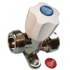 Chrome plated brass straight washing machine valve with backplate 15mm compression to 3/4" hose Operated by plastic handle Both red & blue levers supplied