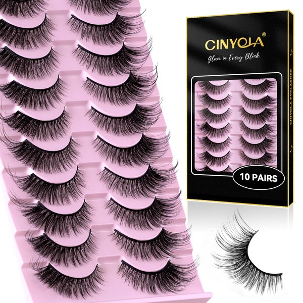 CINYOLA Mink Lash Fluffy Wispy False Eyelashes, 10 Pairs D Curl Fake Cat Eye Lashes Strips Extension Charming Look, Thick Full Volume Russian Fake Lashe Strips Pack