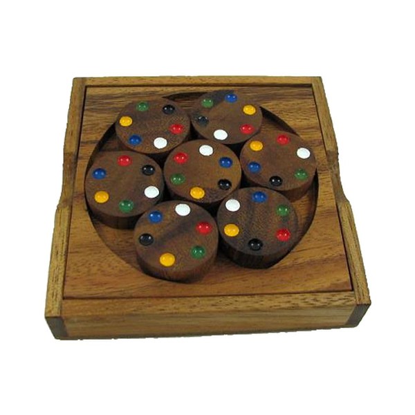 This is a great wooden brain teaser puzzle and not easy at all. The Color Match Wheels Puzzle contains 7 wheels and on each wheel there are 6 different colors dots. The objective is to place all the wooden wheels back into the box in a way that all the adjacent dots have the same color. Comes with a game board and a matching lid.