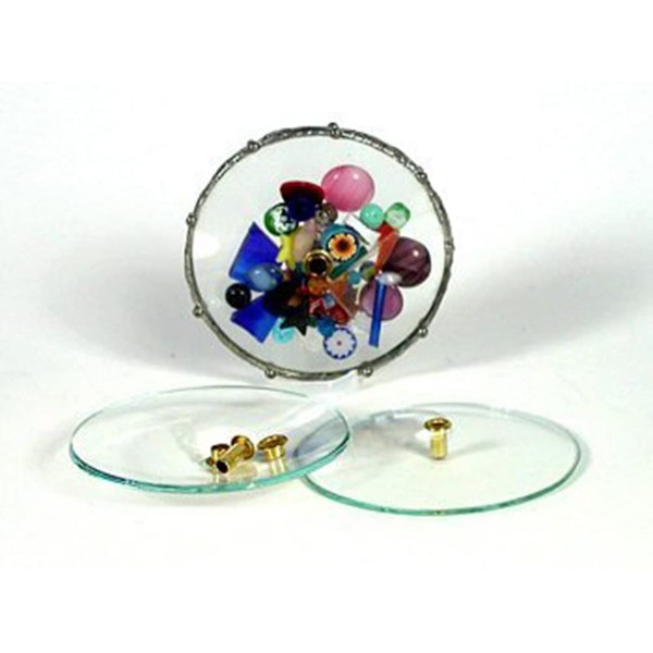 - Each kit contains two 2-1/2" diameter glass domes with center holes, brass mounting eyelets, and instructions. Colored glass in image is not included.