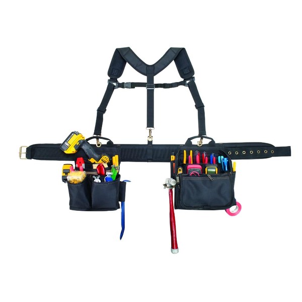 - EVEN WEIGHT DISTRIBUTION: Unique, padded suspenders on this tool belt are engineered to carry loads comfortably and distribute weight evenly without strain on lower back and hips.