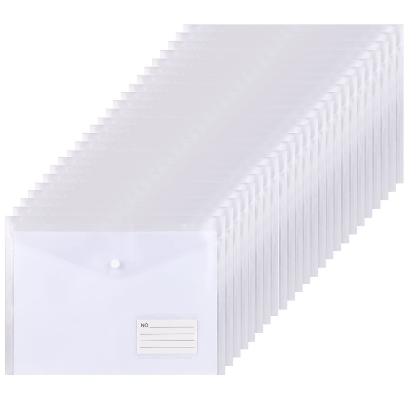 - Package List: 24 pieces of plastic folder wallets in clear. Transparent A4 button wallet make the content visible. It's easy to find documents without opening the A4 clear popper wallets. Greatly improve your work efficiency and save time.