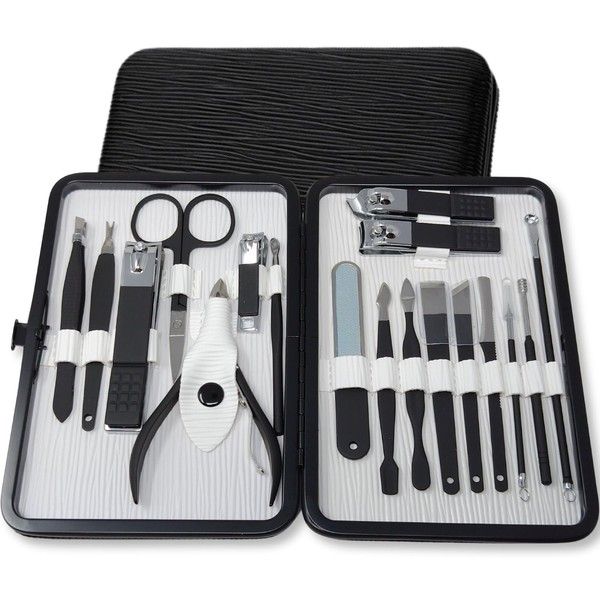 • 【パッと色々】充実の18点セットで手軽にネイルケアを行うことができます。このセットには、爪切り(大中小)、斜め爪切り、眉毛はさみ、キューティクルニッパー、キューティクルトリマー、ピンセット、耳かき、爪やすり、キューティクルプッシャー&ナイフ、ダブルエンドピッカー、ペディキュアナイフ(3種)、ニキビ針、耳かき、ニキビピッカーが含まれています。