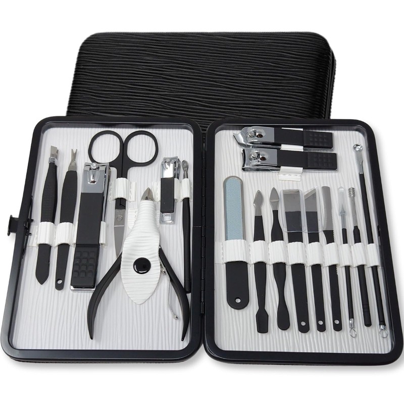 ネイルケアセット、充実の18点セット。コントラストがクールでキュート!見るだけで気分がアガる上品なケース付。コンパクトさも相まってとってもカワイイ。外装の高級PU素材がご好評いただいております。