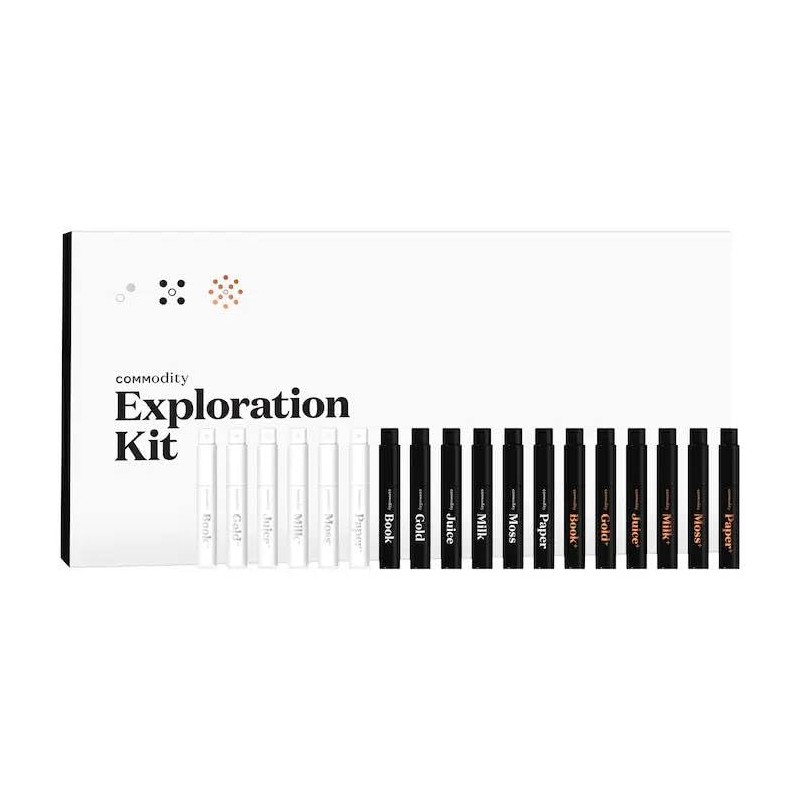 • The Exploration Kit contains all 18 fragrances in Commodity‚Äôs Scent Space Collection. Find a scent and Scent Space for every mood and occasion among Book, Gold, Juice, Milk, Moss, and Paper in their original, Expressive formulations, as well as their Personal and Bold renditions.