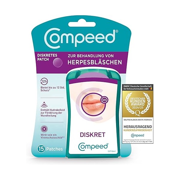 Reduces the risk of infection and discreet coverage. Compeed herpes patch with applicator is a plaster from hra Pharma Deutschland GmbH. The Compeed herpes bubble patch can be used at every stage of an outbreak. However, we recommend using the Compeed herpes patch especially during the wound healing phase of an outbreak, as it accelerates wound healing. The Compeed herpes bubble patch invisible should be worn around the clock until the bubble is cured. A patch dissolves after approx. 12 hours by itself and should then be replaced with a new one. Compeed herpes blowing patch with applicator - quick healing and proven to reduce crust formation in herpes blisters. Instructions for use: wash your hands before and after use. The patch should be applied to cleansed dry skin. Do not apply cream to the lip, otherwise the patch may detach from the lip. Tear off one product along the perforated edge to separate it from the other. Hold the transparent film applicator at the curved end. With both hands, carefully remove the transparent film applicator from the turquoise protective cover. You will see the round herpes blowing patch on the upper part of the applicator. Avoid contact with the adhesive side of the patch. With the help of a mirror, place this part of the applicator on the herpes and gently press it to fix the patch on the herpes. Carefully peel off the applicator and leave the patch in place. Make-up or lipstick can be applied over the patch. Compeed herpes blowing patch with applicator. Optimally store the plaster in dry conditions. The temperature for storage should be a maximum of 25 °C.
