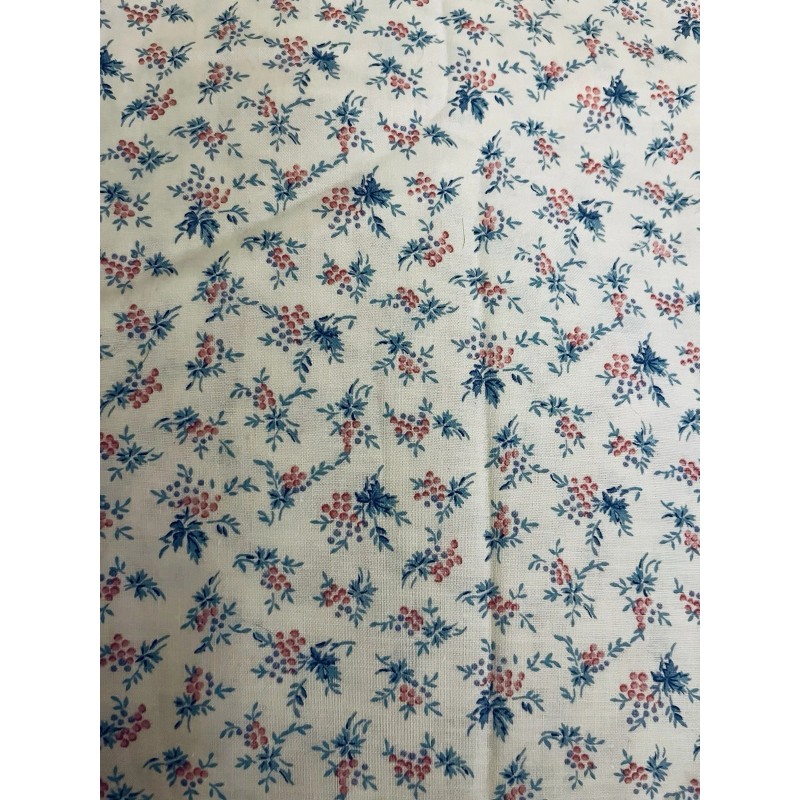 This beautiful cotton fabric features tiny dotted pink and blue florals or grapes patterns on a ivory background.