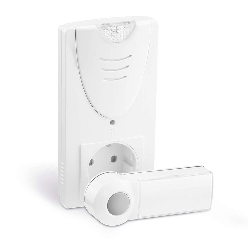 • Wireless doorbell / radio bell set, consisting of a mains operated doorbell module as an "intermediate socket" with additional mains socket as well as integrated LED as receiver and an IP44 protected wireless button including battery as transmitter, colours: white