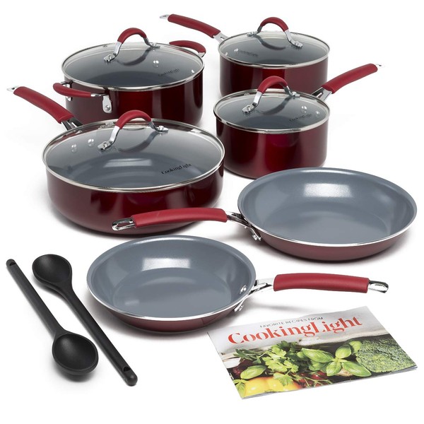 Cook with Confidence. Connect your kitchen to your favorite food magazine, Cooking Light, with this cookware set. The Allure 12-non-stick ceramic cookware set from Cooking Light offers exceptional food release for an easy clean up. Not to mention, the durable non-stick coating is free of PFOA and PTFE making it healthy and . With this 12-piece ceramic non-stick cookware set, you’ll cook with confidence. The tempered glass steam vented lids prevent overflow, and the silicone handles provide a comfortable grip and stay cool to the touch. Use the two scratch safe nylon spoons to stir, baste and scoop. Follow along with the included recipe book to create delicious recipes with ease. Capture the Allure of cooking with this ceramic cookware set from Cooking Light. Comes with a limited lifetime . Cooking Light cookware will Inspire you to create culinary masterpieces in the kitchen!