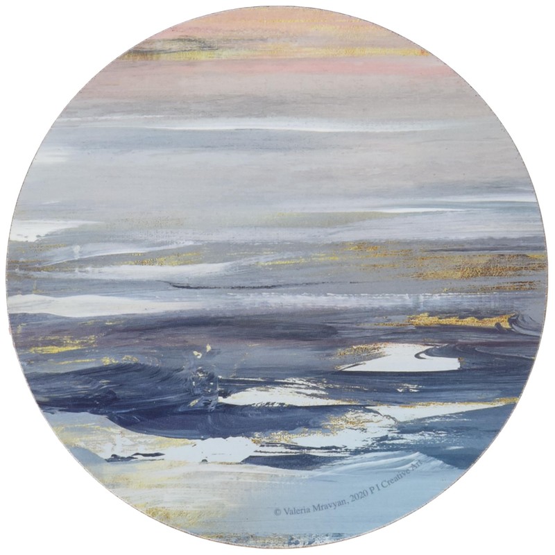 - Bold brush strokes in natural blue, pink and grey hues evoke a sunset on a quiet and peaceful day