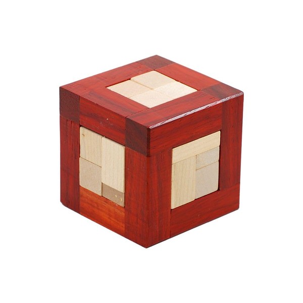 The Cube in Cube puzzle is a so-called 'framed packing puzzle' - all of the pieces must fit inside of the frame, forming a cross shape without the frame. The presence of the frame means that some maneuvering is required in order to solve the puzzle.