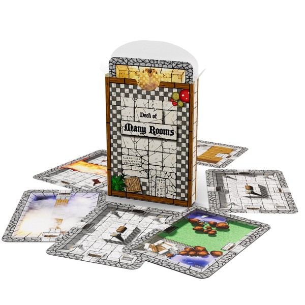 - 25 double sided A7 Cards featuring fantastic Dungeon Rooms.