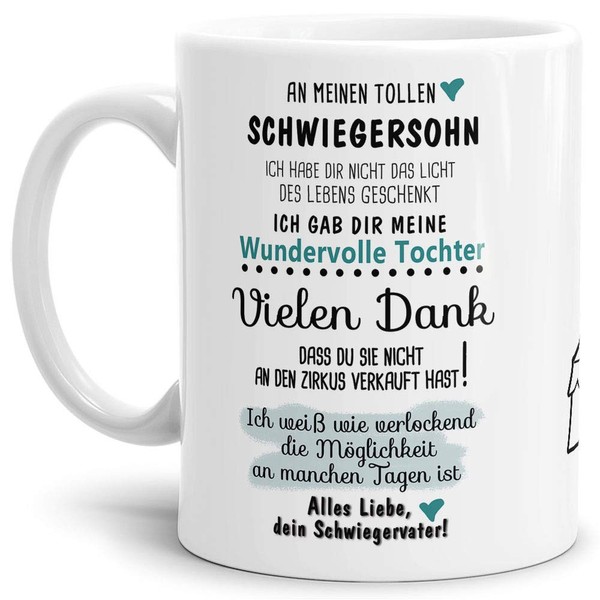 - Beautiful glossy printed coffee mug with motif and saying [German language] for daughter in law or son-in-law, suitable for any occasion - a special gift idea with a difference.