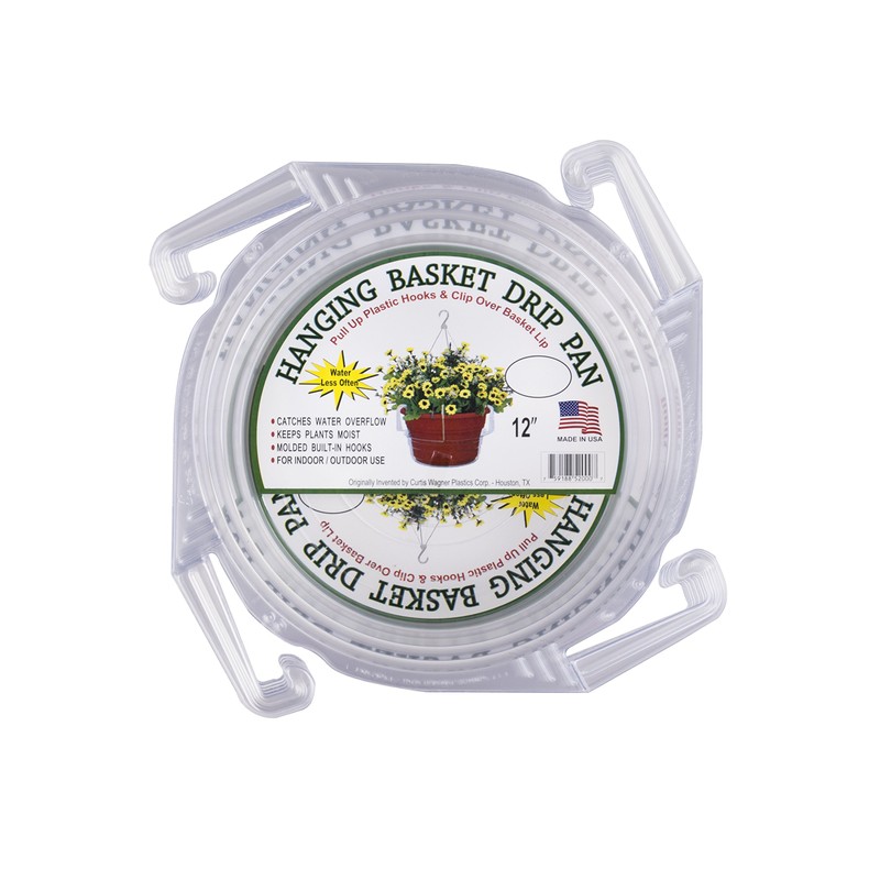 - SPECIFICATIONS - Package includes (10) Curtis Wagner Plastics 12-Inch Clear Hanging Basket Drip Pan Saucers. Drip pans have a 9” diameter on top, a 3 1/2” depth, and a 7 3/8” diameter on bottom.