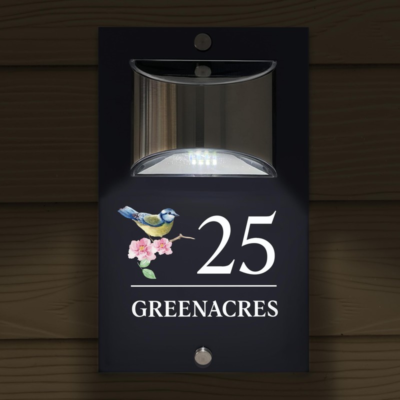 Custom Signs Solar Illuminated Modern Anthracite House Number Sign 24cm x 14.5cm Blue Bird Design