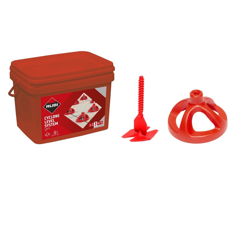 RUBI Tools USA introduces the new Cyclone Level System. The main function of this new LEVEL SYSTEM is to avoid the generation of lippage during the installation of ceramic tiles, both during flooring and cladding. RUBI leveling systems are especially recommended to improve the finishes when working with large-format tiles. Although they can also be used in smaller formats (recommended from 12" x 12" inch tile) and always with double gluing. Make sure to use a regularized support and in perfect flatness conditions for optimal results. The use of the CYCLONE LEVEL SYSTEM, by RUBI, is very easy and intuitive. In addition, the results are less sensitive to the user's skill and experience than with the rest of the leveling systems on the market. The CYCLONE LEVEL SYSTEM flange range has different thicknesses and includes cross and T bases to replace * the traditional tile spacers. Each flange thickness is easily identified thanks to the range of different colors available. The threaded hoods are reusable. The large round base ensures a homogeneous pressure at all times. The design of the CYCLONE LEVEL SYSTEM hoods has been specially conceived to maximize ergonomics during manual tightening, (The CYCLONE LEVEL SYSTEM doesn't require any additional tools, neither for tensioning nor for breaking.) as well as offering the best possible visibility in the interior area of the hood (where we can see if there is excess adhesive or if the positioning between tiles is correct). The removal of the CYCLONE LEVEL SYSTEM, by RUBI, is carried out by the impact, as we have said before, it does not require any additional tool. At RUBI we have always been concerned about the health of the professional. The concept of ergonomics is always very present within the design of our tools since we believe that safety and minimizing the risks of injury at work are essential for health and for proper execution. * Only CROSS and T-based models are substitutes for ceramic tile spacers