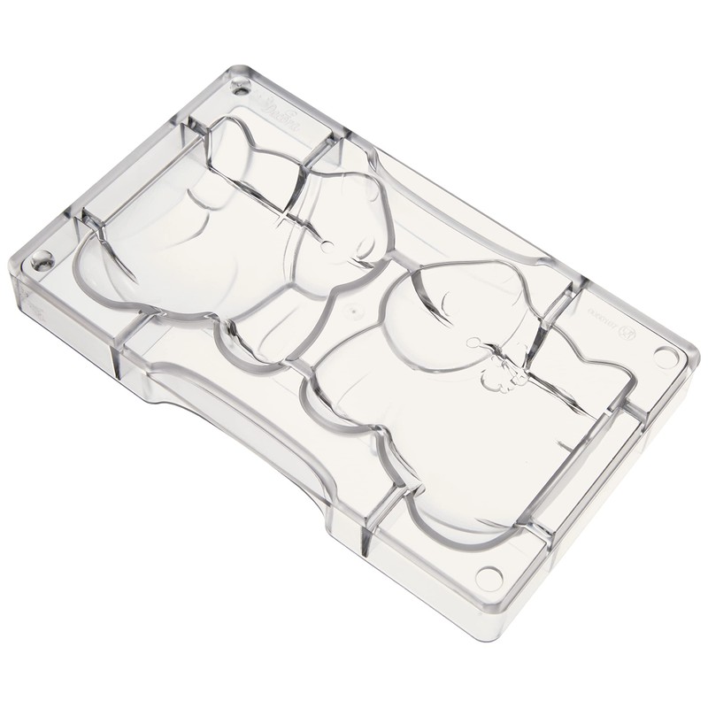 - Contents – At home, you will receive a polycarbonate mould with 2 recesses of 94 x 80 mm, ideal for making a cute chocolate bunny. Polycarbonate is the ideal material to ensure your chocolates are shiny and crispy.