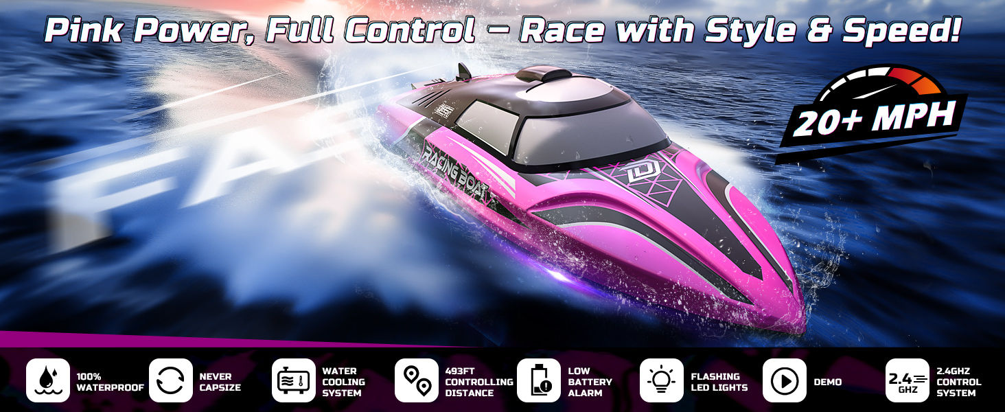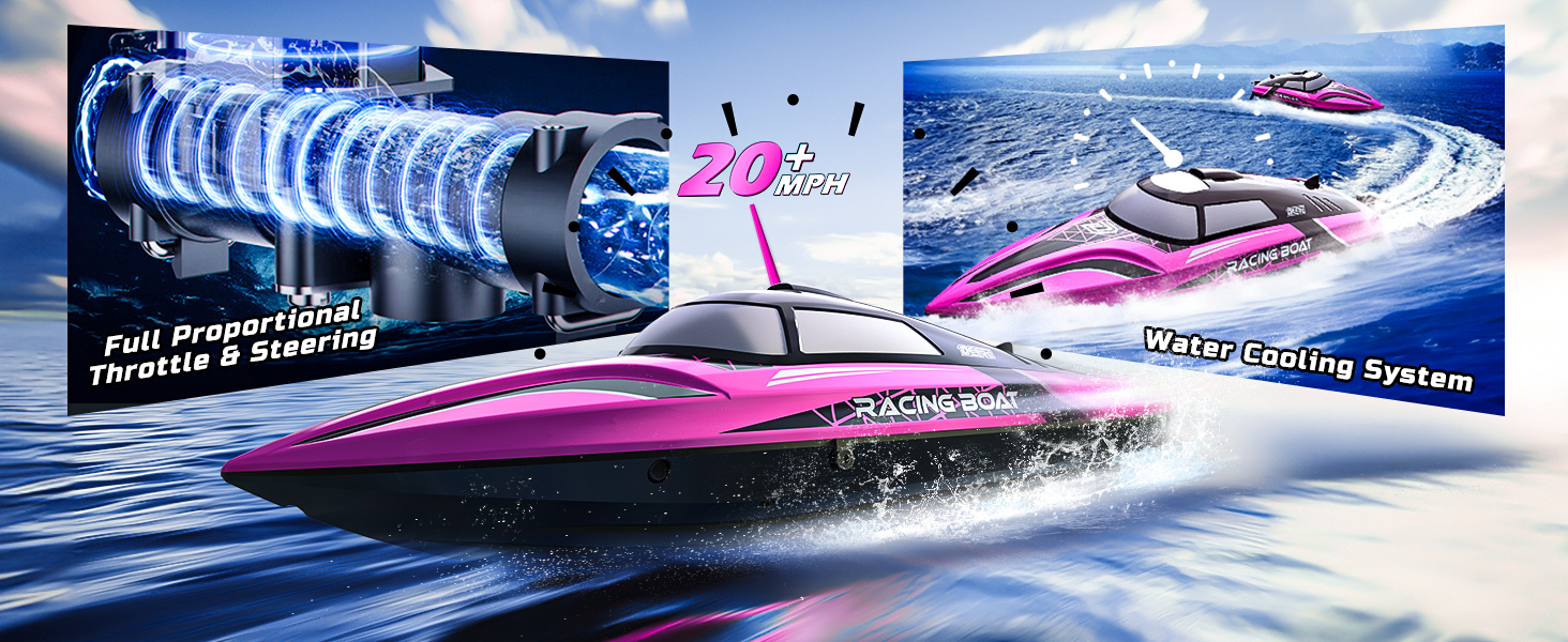 - Bold Color, Serious Performance – With a striking pink design made for those who dare to be different, this high-performance RC boat races at 20+ MPH and features fully proportional throttle and steering for precise control. The built-in water cooling system keeps the motor running efficiently even during high-speed action.