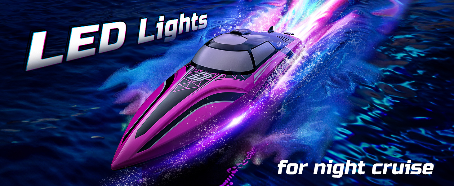 - Auto-Pilot Demo Mode with LED Lights – Activate the auto-pilot mode with a single click and watch the boat perform smooth figure-8 or circular “O” patterns. It’s a relaxing way to enjoy the water as the boat creates eye-catching splashes and light trails—all on its own.