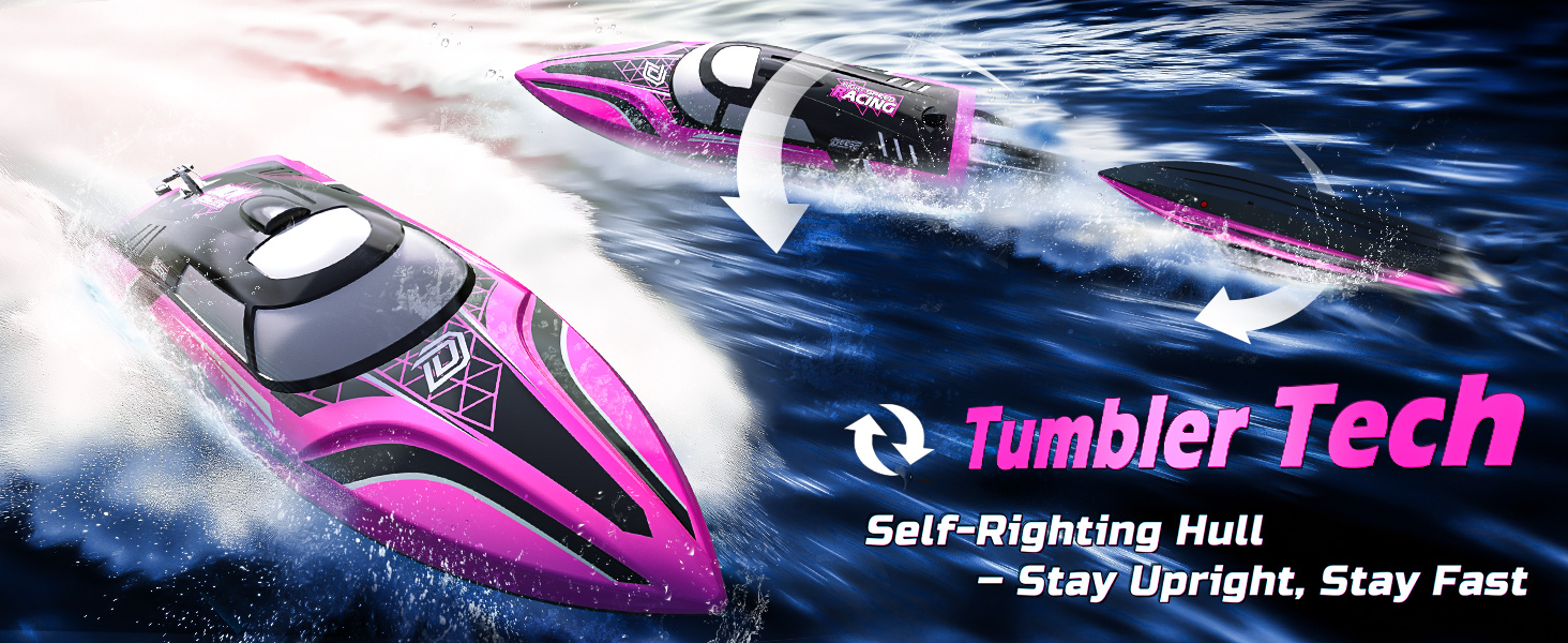 - Tumbler Design for Auto Recovery – Built with a smart self-righting structure, this remote control boat flips back upright with its 180° capsize recovery function—so you can race confidently through waves and wind without worry.