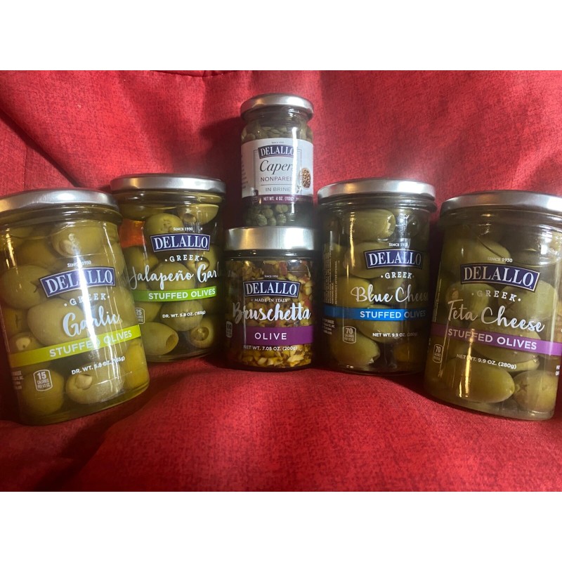 Delallo Winter & Fall Selection Of Olives Jalapeno Garlic,Blue Cheese, Garlic,Feta Cheese,Olive Bruschetta,Capers Made in Italy