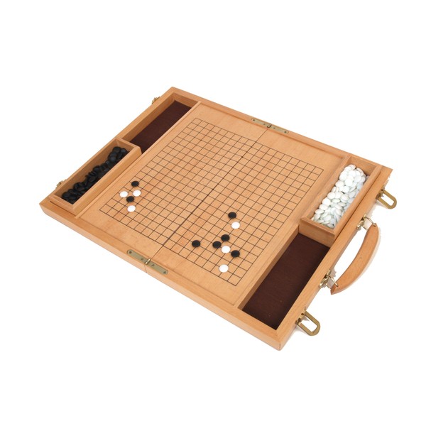 Deluxe Wood Go Game Set. Go, the strategic board game created in China thousands of years ago and played by millions arounding the world using focus and the ability to strategize. This game's solid wood playing surface folds into a handy carrying case with wood storage boxes to hold the Go stones.