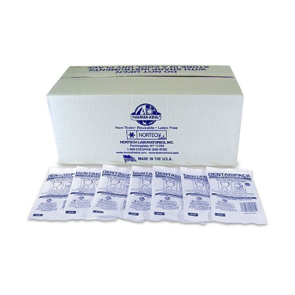 Dental Pack Cold Pack reduces swelling and discomfort from extractions, root canals, and other post-operative procedures. Comfortable weight with no messy dripping. Stays soft - flexible when frozen. Non-toxic and environmentally friendly. Quick, Safe, Effective First Aid. Size: 4" x 5". 50/Case.