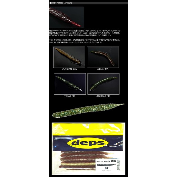 - The straight form of the slimming effect is outstanding even in densely weed areas. The wacky setting with high water resistance fat body and high density ultra soft material induces bites with bold shape changes and strong waves, with strong resilience that reduces movement distance