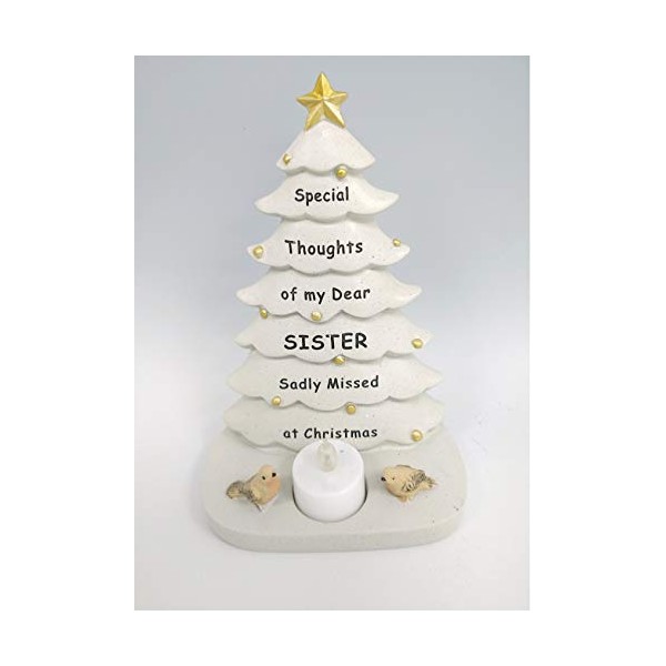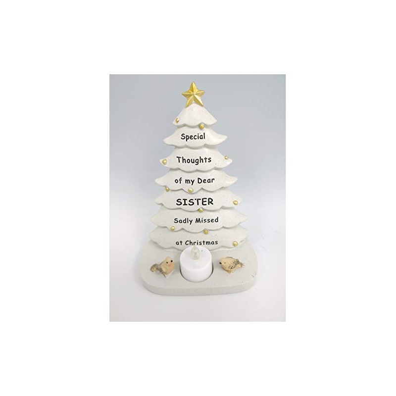 - A charming memorial tribute, in a Christmas tree shape, the resin base which has space for the battery operated tea light and two robins either side. The verse is displayed on the Christmas tree, which is decorated with gold baubles.