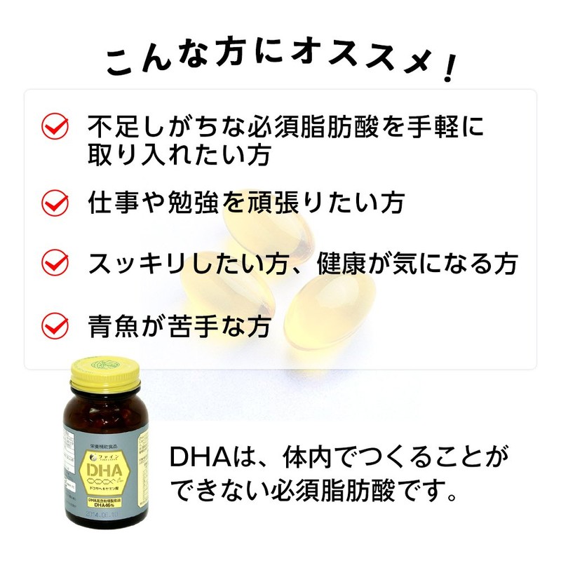 - DHAは、不飽和脂肪酸・α-リノレン酸の一種で、体内でつくることができない必須脂肪酸。魚を食べる事が少ない方は、特に不足しがちな成分です。