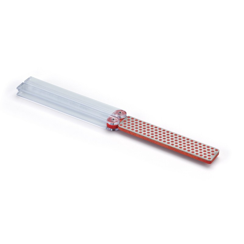 Red, fine grit. Clear folding handle doubles as sheath for this pocket size 4 1/2" closed diamond whetstone. Less than 1" wide. Suitable for most any sharpening need. Portable enough to take anywhere. Hang packaged.