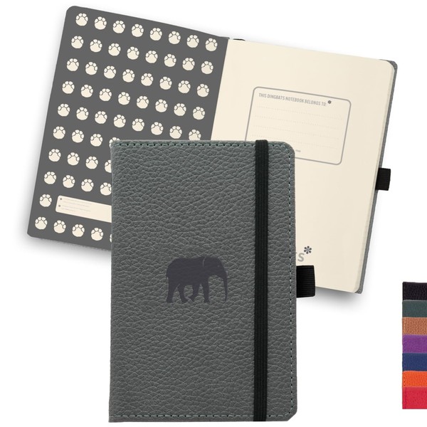 - A6 notebook with many functions: Dingbats notebooks exude quality - this hardcover leather notebook is made of vegan PU leather, micro-perforated cream 100gsm pages, an elastic closure and a pen holder. The notebook is equipped with an elephant footprint at the end of the pages and an inner pocket for added detail. It is the perfect gift for your loved ones.
