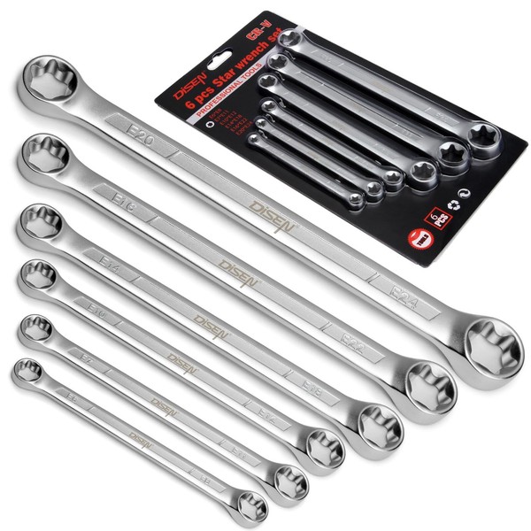 DISEN 6-Piece E-Torx Wrench Set, Double Box End Wrench Set, CR-V Steel, Spanner Set Including E6*E8, E7*E11,E10*E12, E14*E18, E16*E22 and E20*E24