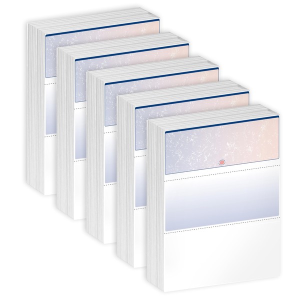 - Pack includes 2500 blank checks (8.5" wide x 3.5" tall); full sheet is 8.5" x 11", 24 lb; blue/red prismatic check on top with 2 perforations 7.5" and 4" from bottom of sheet